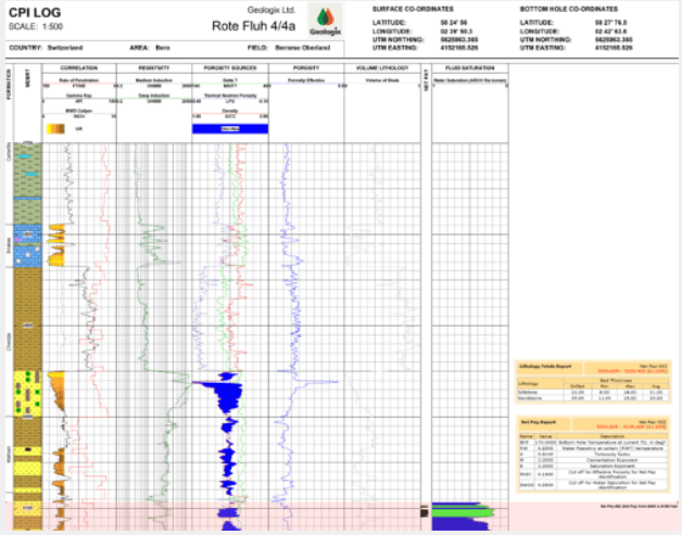 Therefore, during the drilling, both water saturation and net pay are calculated in real-time, and a composite log is created, combining mudlogging and LWD data. This gives a far better view of the well leading to improved decision making. The net pay report can then be produced from the composite log to give a quick indication of the total thickness of hydrocarbon contained in the well.